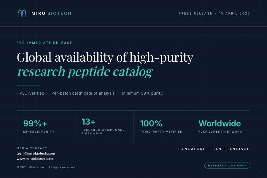 BANGALORE and SAN FRANCISCO, April 15, 2026. Miro Biotech today announced the global availability of its research-grade peptide catalog, extending HPLC-verified compounds to individual researchers, laboratories, and academic institutions across India, North America, Latin America, Europe, Africa, Asia-Pacific, and the Middle East.